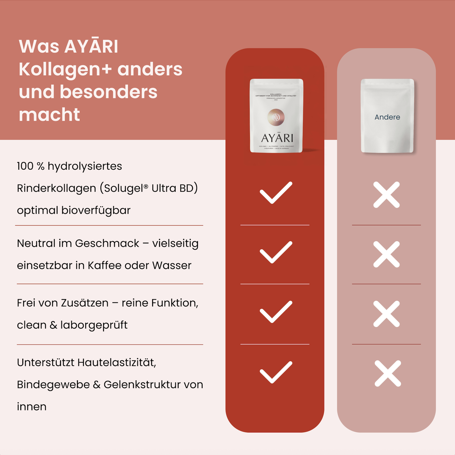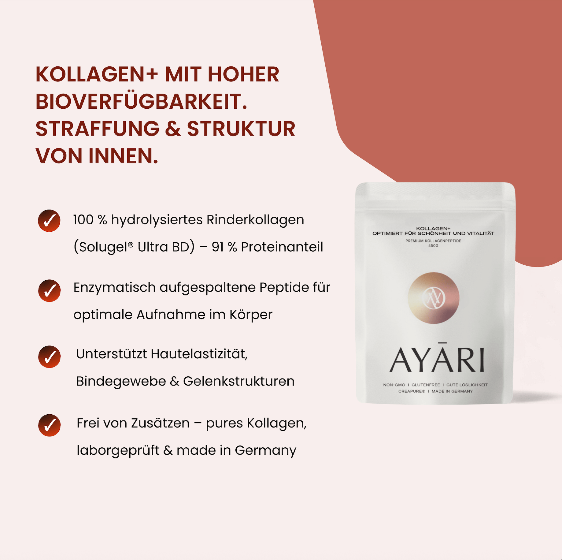 AYARI KOLLAGEN+ liefert enzymatisch aufgespaltenes Kollagen in Peptidform – ideal löslich, neutral im Geschmack, besonders gut verträglich.