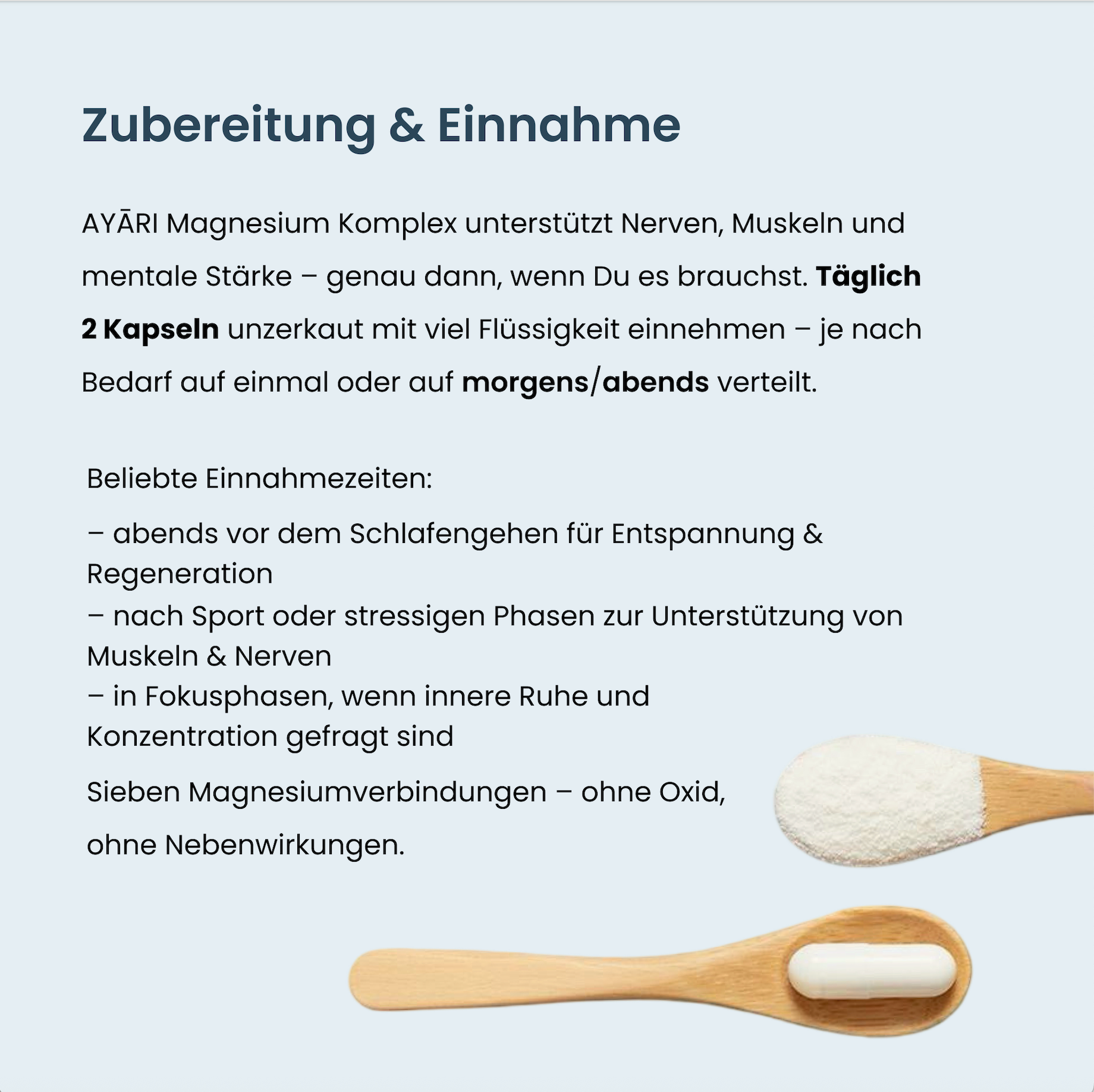 Unser AYARI Magnesium Komplex kombiniert sieben bioverfügbare Magnesiumformen, die den Körper gezielt und umfassend unterstützen. Von der schnellen Aufnahme von Magnesiumcitrat bis zur sanften Wirkung von Magnesiumbisglycinat bietet jede Form spezifische Vorteile – ohne unnötige Zusätze und Magnesiumoxid. Diese hochwertige Mischung fördert nachhaltige Gesundheit und Wohlbefinden.