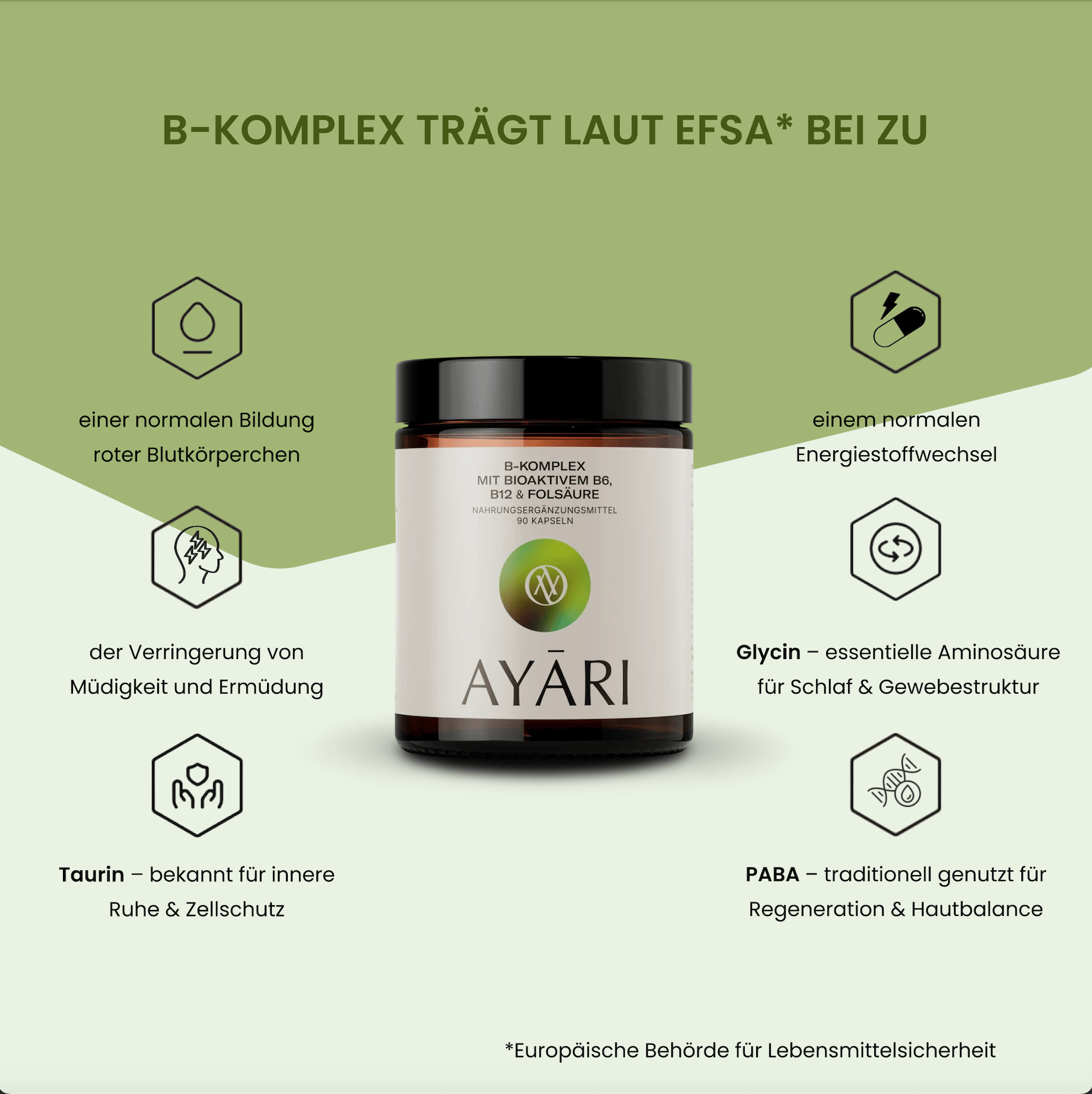 The AYARI B-Complex provides all eight B vitamins in bioactive forms, including pyridoxal-5-phosphate (B6), methylcobalamin (B12) and 5-MTHF (folic acid), which promote optimal absorption. In addition, the formula contains choline and inositol to support fat metabolism and liver health - without fillers, manufactured to the highest quality standards in Germany.