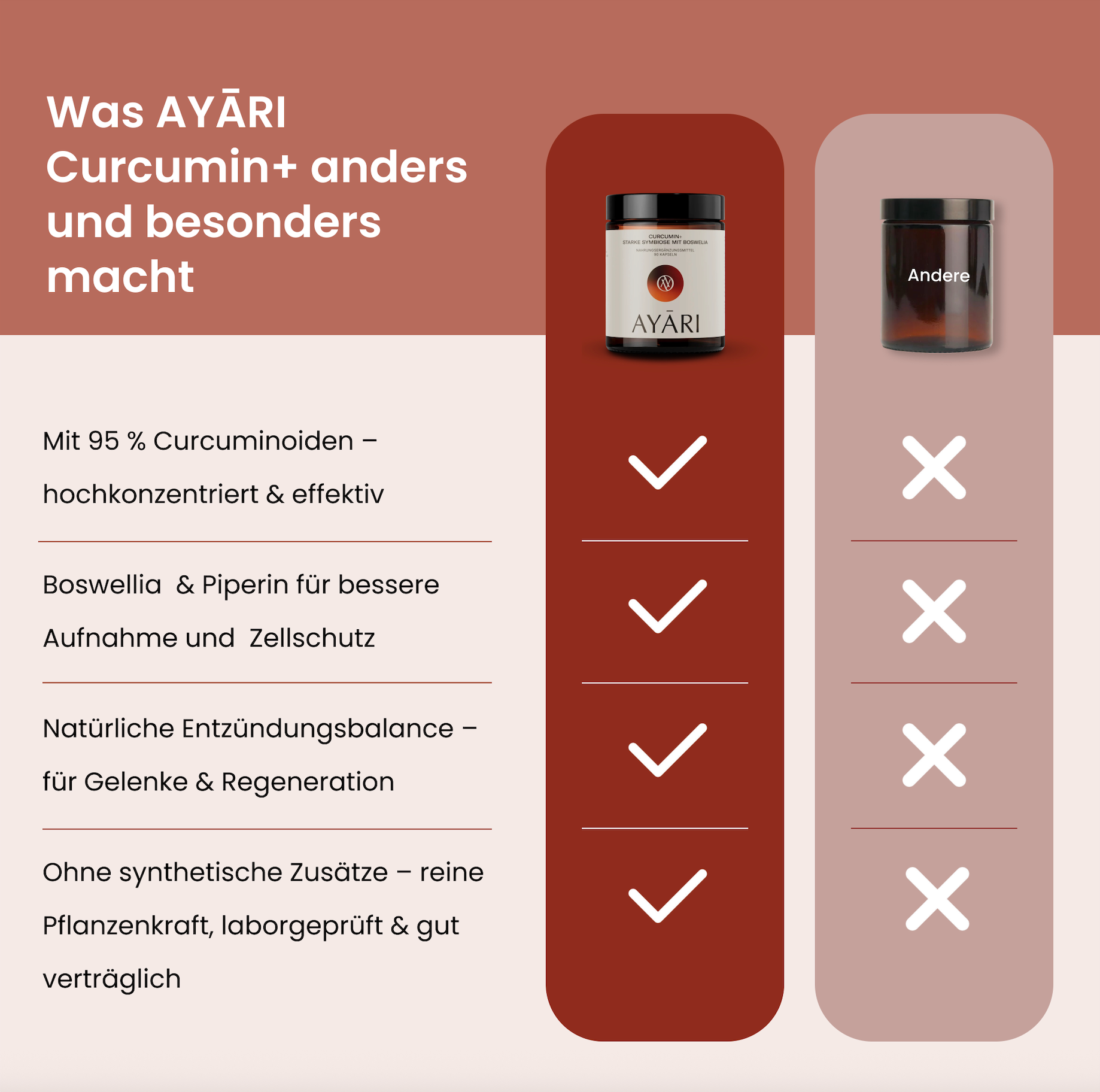 Curcumin+ contains high-quality ingredients to support natural inflammation regulation, joint health and antioxidant cell protection. It promotes digestion, joint mobility and protects skin cells from premature aging. Made in Germany, AYARI Curcumin+ offers the highest purity and quality without synthetic additives - a natural product you can rely on.