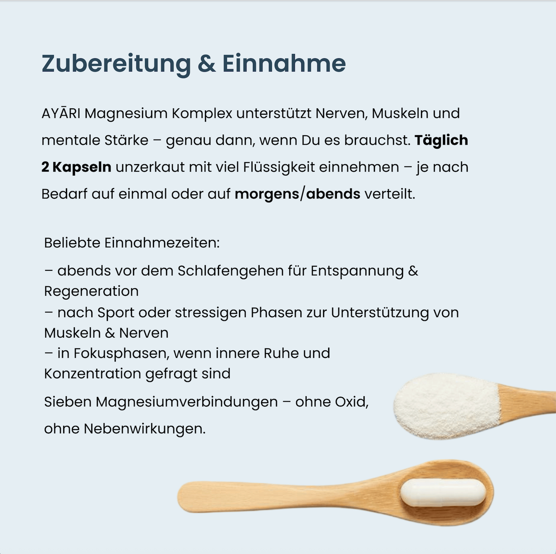 Our AYARI Magnesium Complex combines seven bioavailable forms of magnesium that provide targeted, comprehensive support to the body. From the rapid absorption of magnesium citrate to the gentle effect of magnesium bisglycinate, each form offers specific benefits - without unnecessary additives and magnesium oxide. This high-quality blend promotes long-term health and well-being.