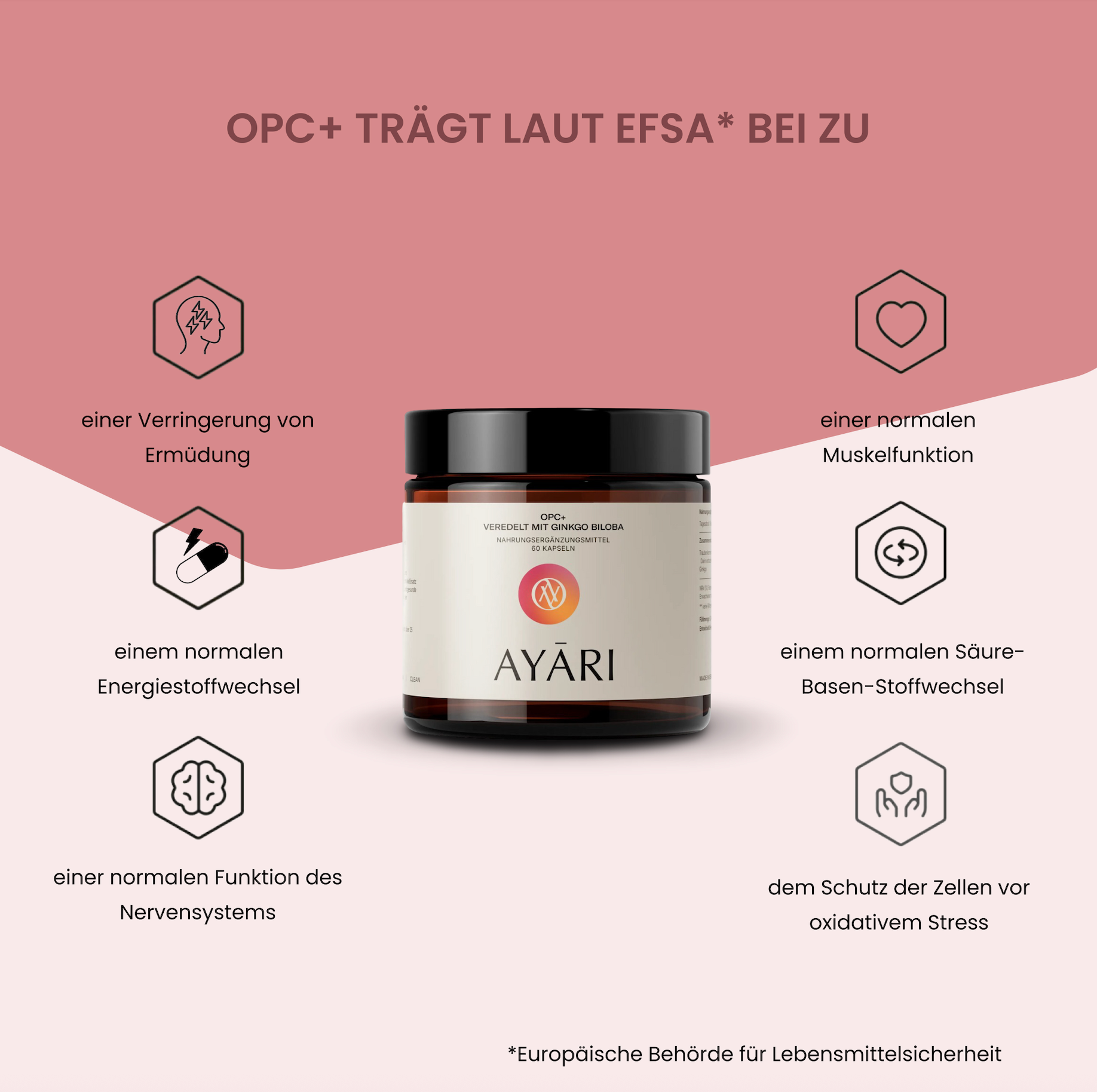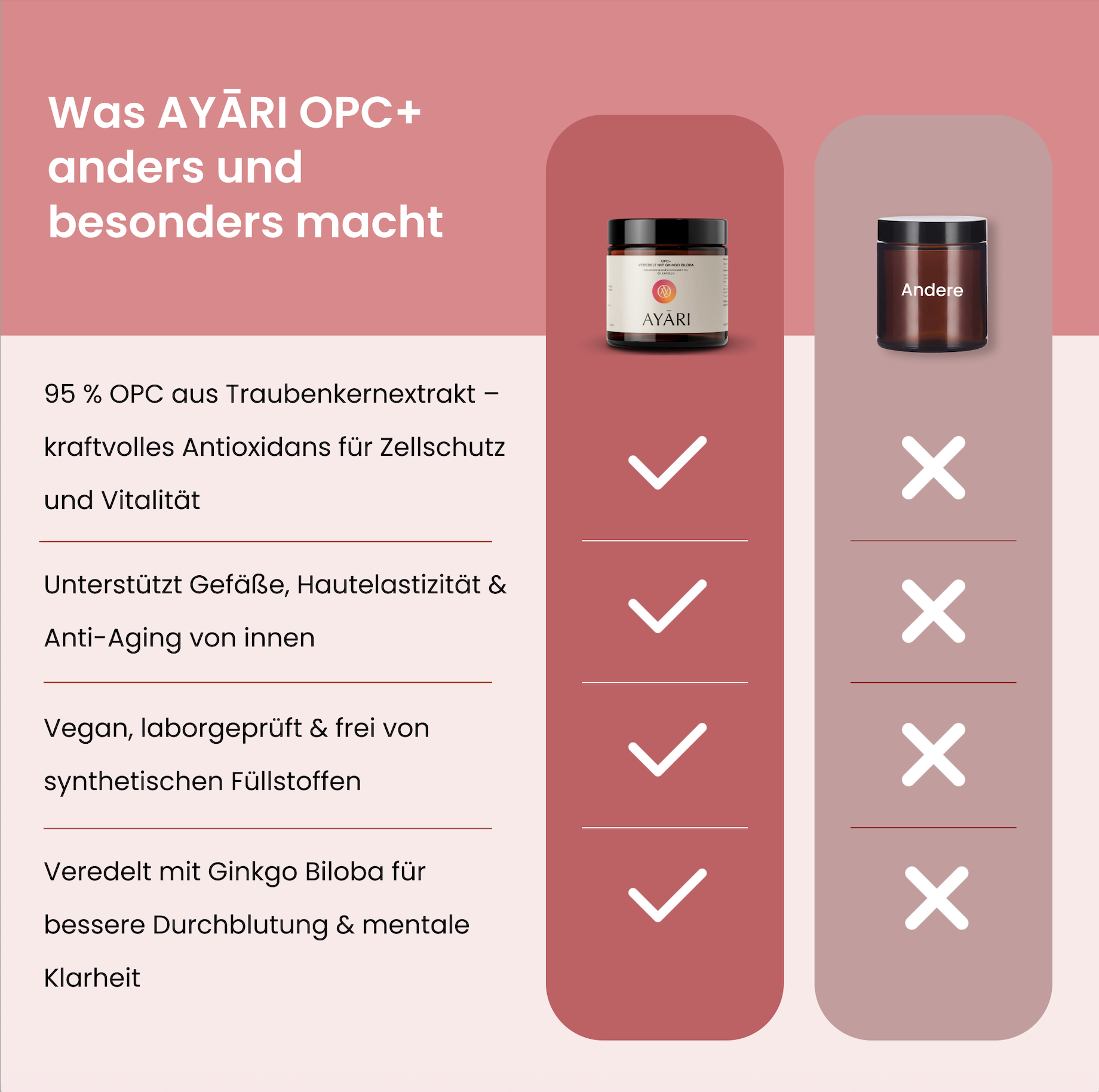 Thanks to high-quality OPC from French grape seeds and the addition of Ginkgo biloba, our product offers the highest bioavailability. AYARI's OPC+ is 18 times more potent than vitamin C and 40 times more potent than vitamin E and also enhances the effects of other antioxidants. Choose OPC+ and rely on quality and effectiveness for increased vitality and holistic health.