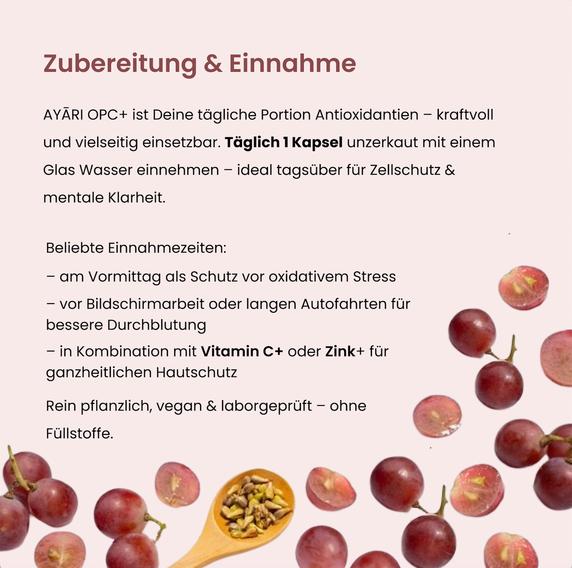 Our OPC+ combines highly concentrated grape seed extract (OPC) with Ginkgo Biloba for maximum health benefits. OPC is one of the most powerful natural antioxidants that protects cells from oxidative stress, strengthens the immune system, supports healthy blood vessels and slows skin aging. Since its discovery in 1948, OPC has been known for its positive effects on the cardiovascular system, skin elasticity and cognitive function, while Ginkgo Biloba promotes mental clarity and concentration.