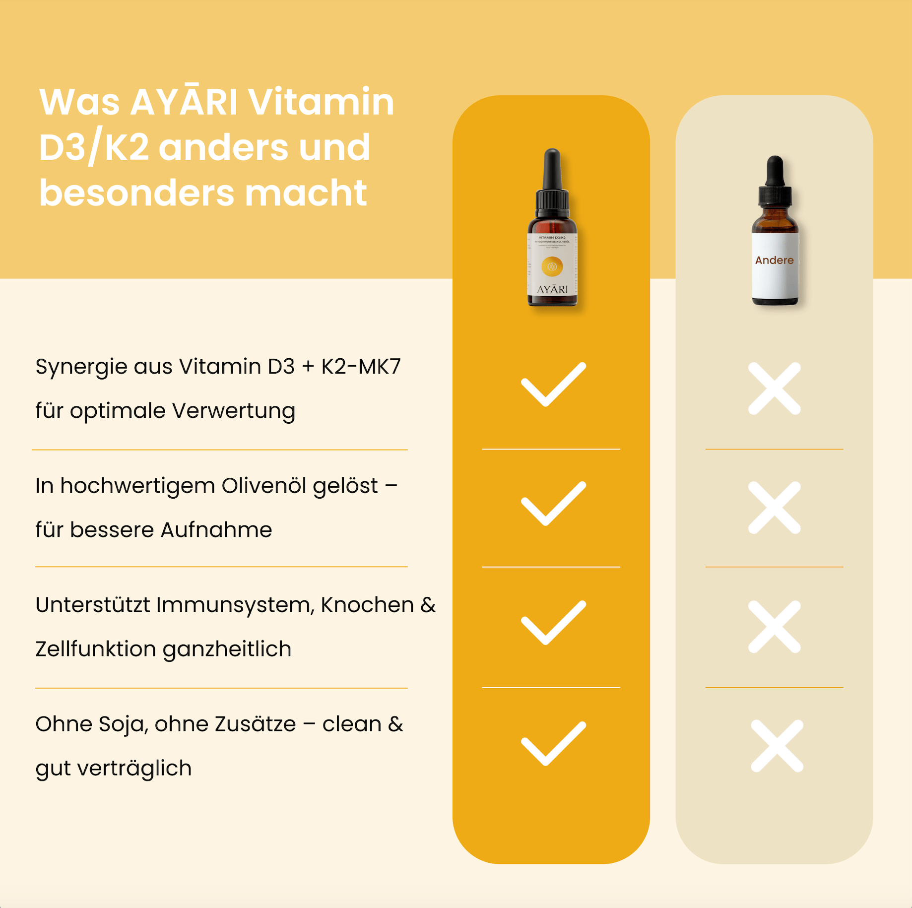 Vergleichsgrafik: AYARI Vitamin D3/K2 im Olivenöl-Träger im Vergleich zu anderen Produkten, Vorteile wie hohe Qualität und gute Verträglichkeit