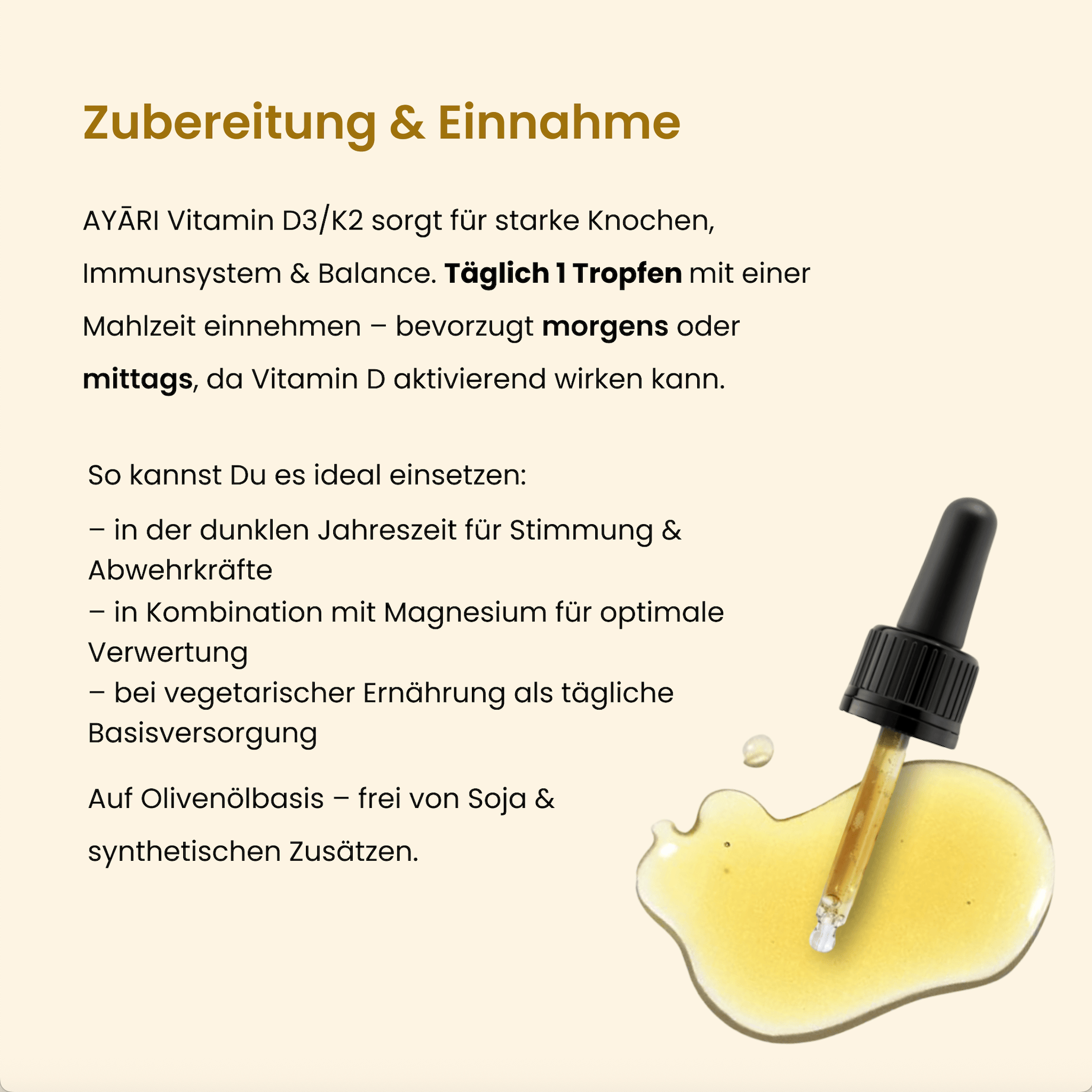 AYARI Vitamin D3/K2 mit Olivenöl – Tropfflasche mit Öltropfen, Text zu Knochenkraft und Immunschutz auf warmgelbem Hintergrund